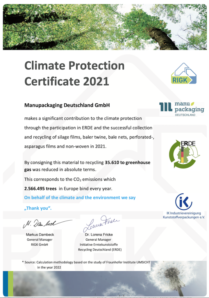 A Manupackaging Deutschland GmbH a siló- és stretchfóliák, bálázózsinegek, bálahálók, perforált fóliák, spárgafóliák és nem szőtt anyagok gyűjtésével és újrahasznosításával 2021-ben is jelentősen hozzájárult a klímavédelemhez.