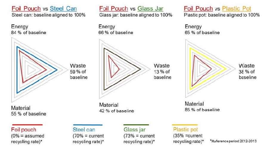 A tanulmány a fenti modellt alkalmazta egy 460 ml-es, tartós tésztaszószhoz készült laminált, rugalmas tasakos csomagolási megoldás esetén. Ezt a tasakot három alternatív, nem rugalmas csomagolási rendszerrel hasonlították össze: egy üvegedénnyel, egy konzervdobozzal és egy műanyag dobozzal. Az eredmények azt mutatták, hogy a fóliatasakos megoldás (a teljes csomagolási rendszert figyelembe véve, beleértve a másodlagos és harmadlagos csomagolást is) mindhárom mérőszám tekintetében erőforrás-hatékonyabb volt, mint az alternatív megoldások.