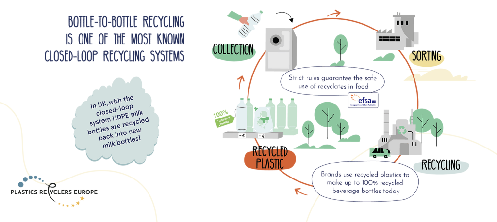 A legelterjedtebb zártláncú újrahasznosítási módszer az úgy nevezett “bottle-to-bottle”, azaz palacktól-palackig rendszer, amelynek keretében például a PET-palackokon kívül a HDPE tejes flakonok is új életet kaphatnak. A cégek a visszagyűjtés segítségével így 100%-ban újrahasznosított csomagolást használhatnak termékeik forgalmazására.