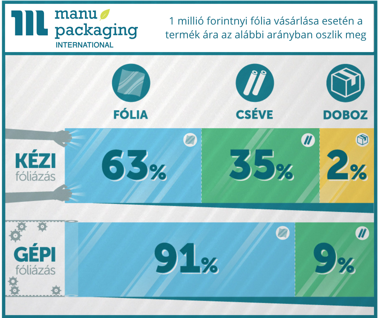 - Gépi fóliázás: a legköltséghatékonyabb megoldás. Mivel a gép fóliák tömegének 91% értékes fólia és csupán 9% cséve+kartondoboz. Ezzel szemben a kézi fóliák esetében 63% csupán az értékes fólia és 37% a cséve+kartondoboz. Tehát ugyanazért a pénzért 50%-kal több értékes fóliát kapunk!